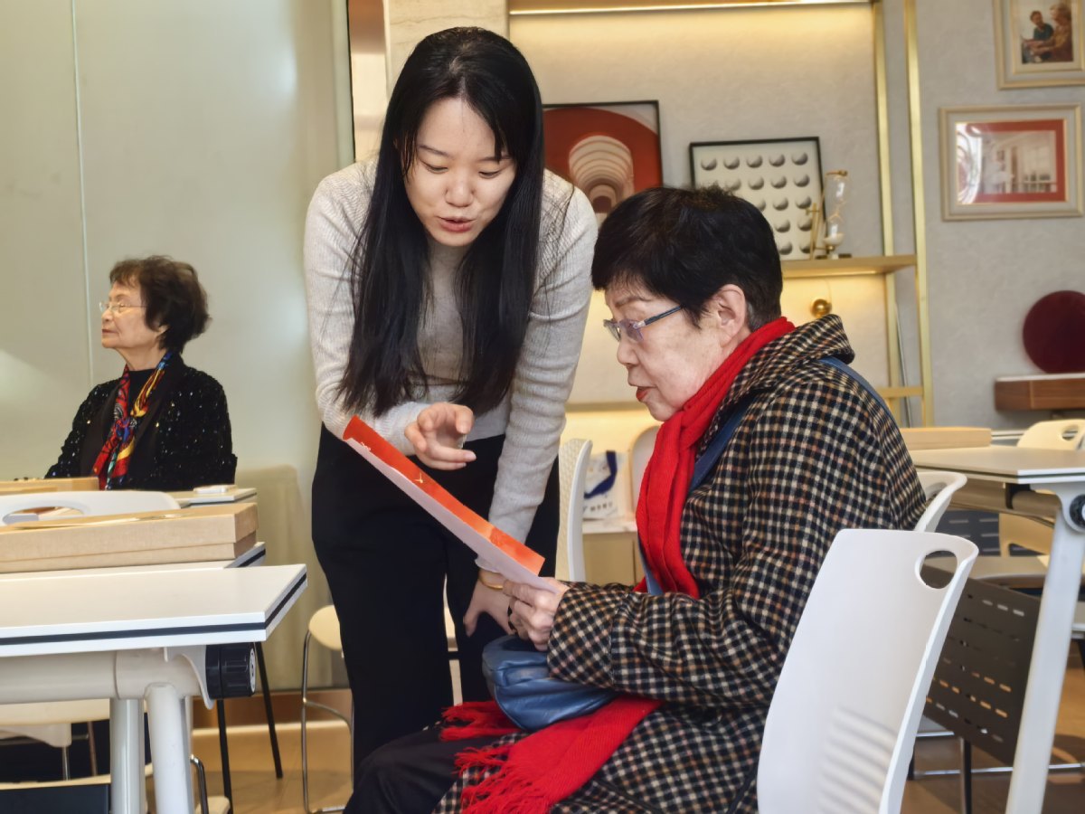 Zhu Yancheng (в средата) напътства възрастен жител в използването на Lanvita, платформа за мемоари с изкуствен интелект, в старчески дом в Хефей, провинция Анхуей, през ноември 2025 г. [Photo provided to chinadaily.com.cn]