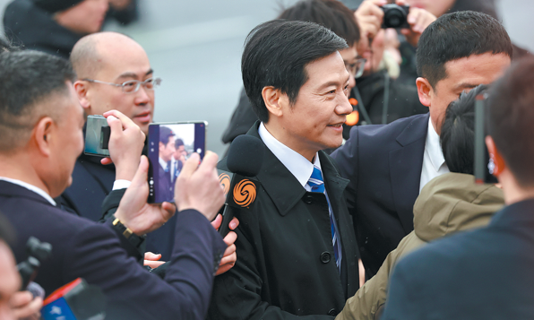 Лей Джун (в средата), основател на Xiaomi, интервюиран от репортери на текущите две сесии в Пекин. ДЖАН УЕЙ/КИТАЙ ДЕЙЛИ