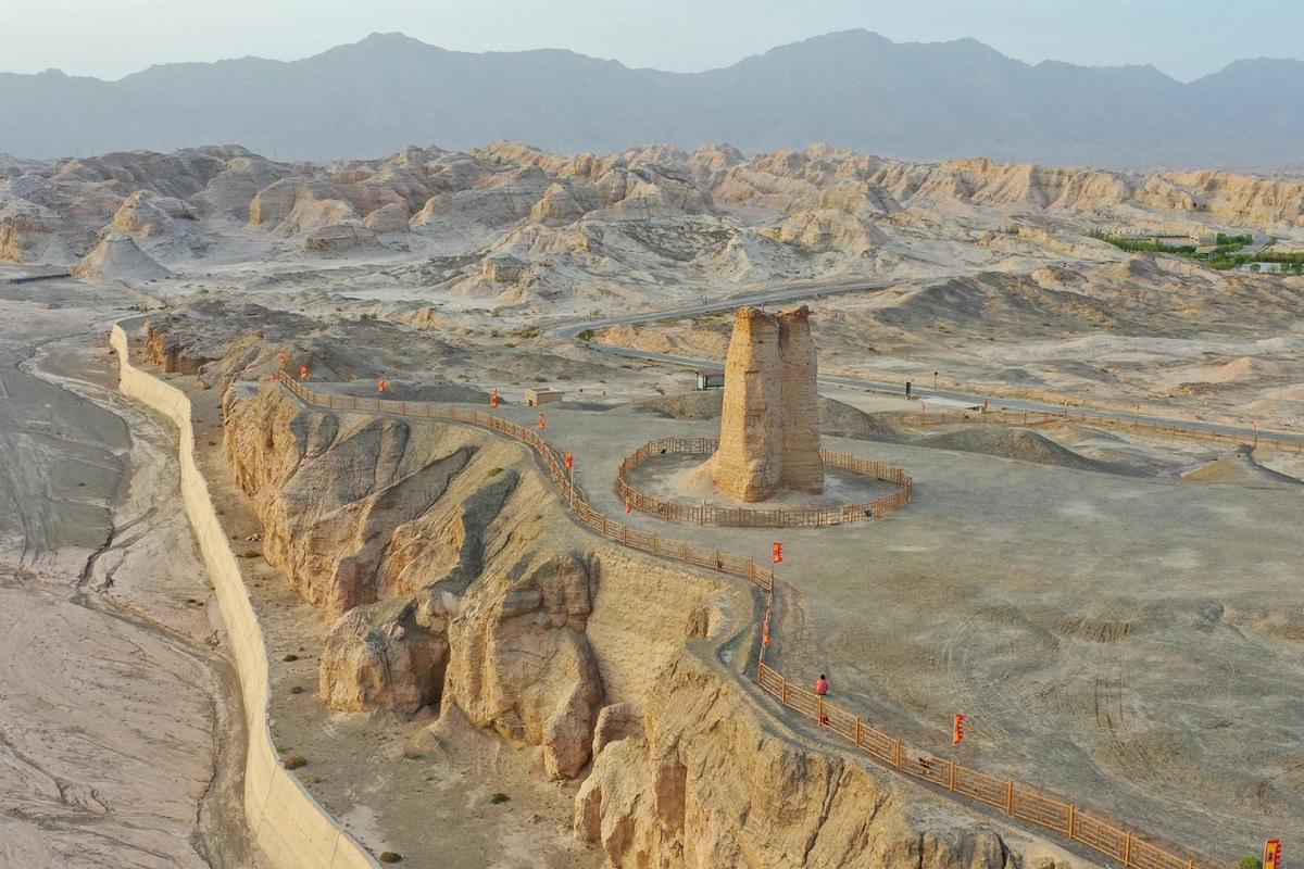 Снимка с дрон показва кулата Kizilgaha Beacon Tower в град Кука, Синдзян-Уйгурски автономен район на Северозападен Китай, 8 септември 2023 г. [Photo/Xinhua]
