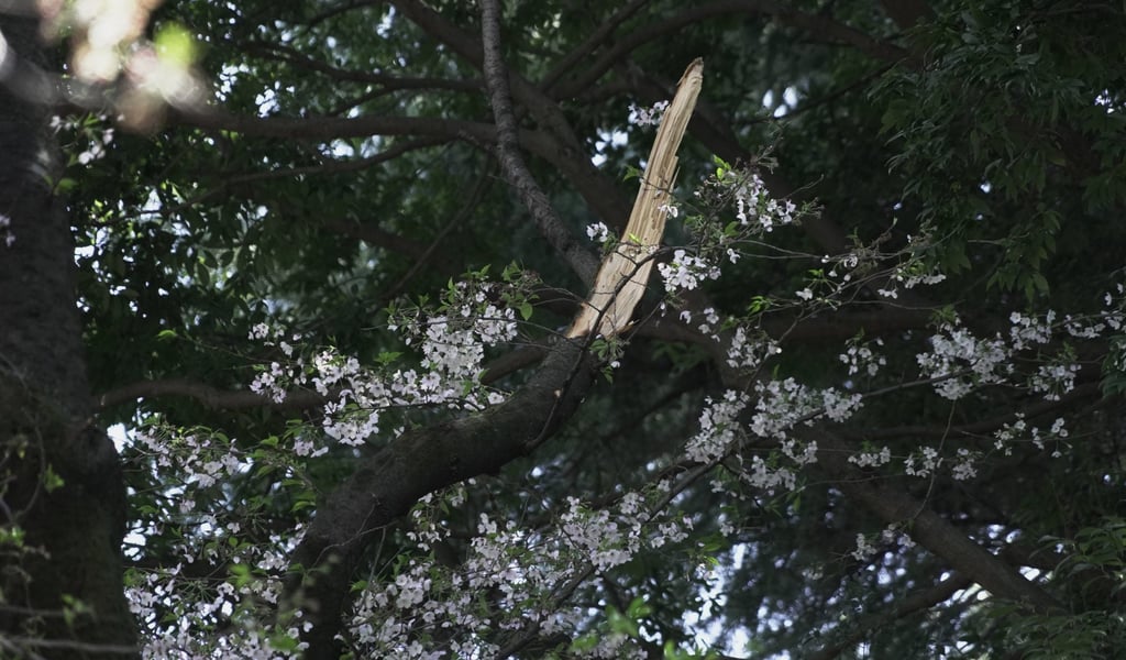 Счупен клон е захванат от повредено черешово дърво, след като близко дърво падна върху него в парка Кинута в Токио в петък. Снимка: APСчупен клон е захванат от повредено черешово дърво, след като близко дърво падна върху него в парка Кинута в Токио в петък. Снимка: AP