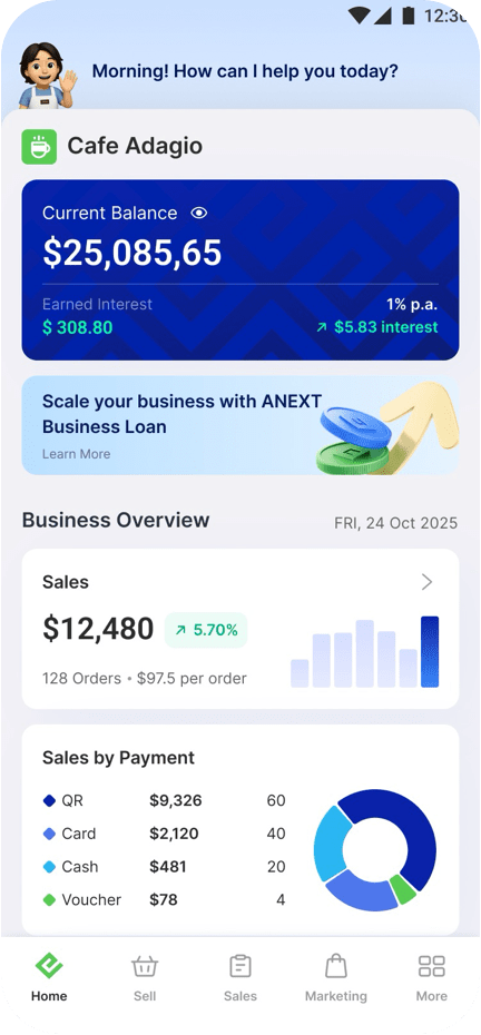 Отговарящите на условията търговци могат да получат незабавно одобрение за заем до 5000 сингапурски долара при регистрация за посрещане на краткосрочни нужди чрез ANEXT Bank, с налични по-високи лимити и опции за финансиране, базирани на приходите, с нарастването им.