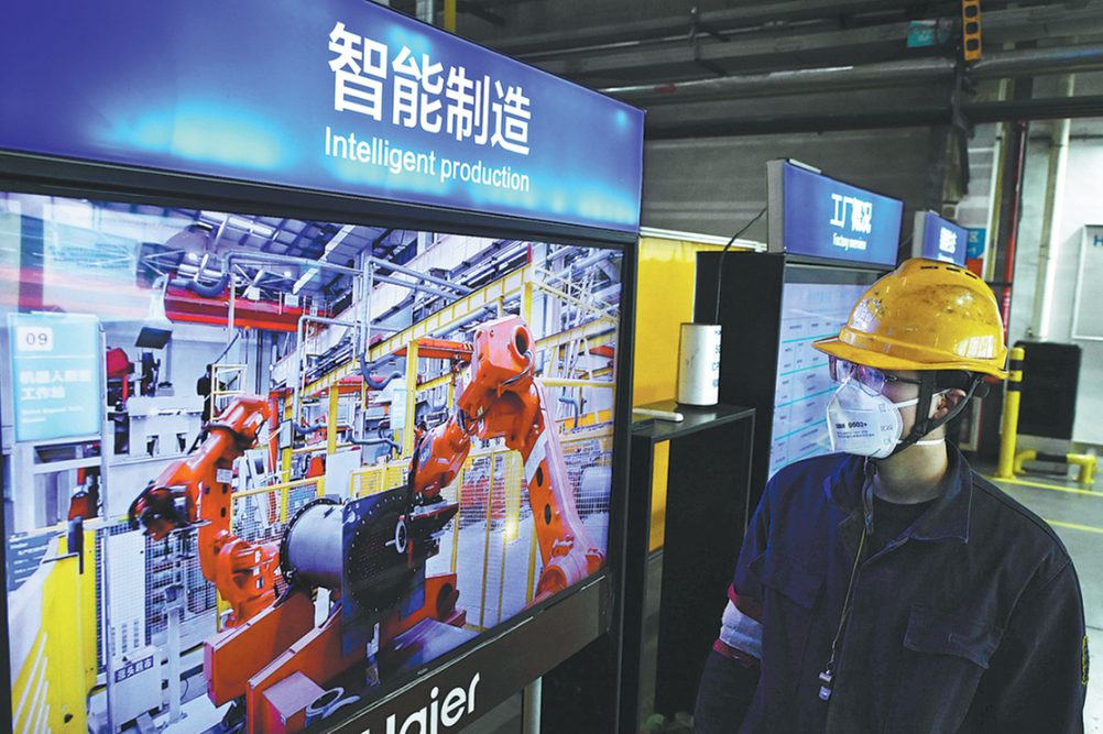 Служител обяснява как работят интелигентните роботи в производствената линия на фабриката за централна климатизация на Haier в Циндао, провинция Шандонг, на 27 ноември. LI ZIHENG/XINHUA