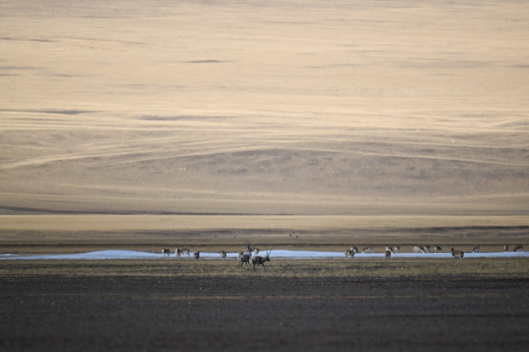 Тази снимка, направена на 5 декември 2025 г., показва тибетски антилопи в Националния природен резерват на планината Алтун, убежище от 45 000 квадратни километра, разположено в югоизточния ъгъл на автономния регион Синцзян-Уйгур, северозападен Китай. [Photo/Xinhua]